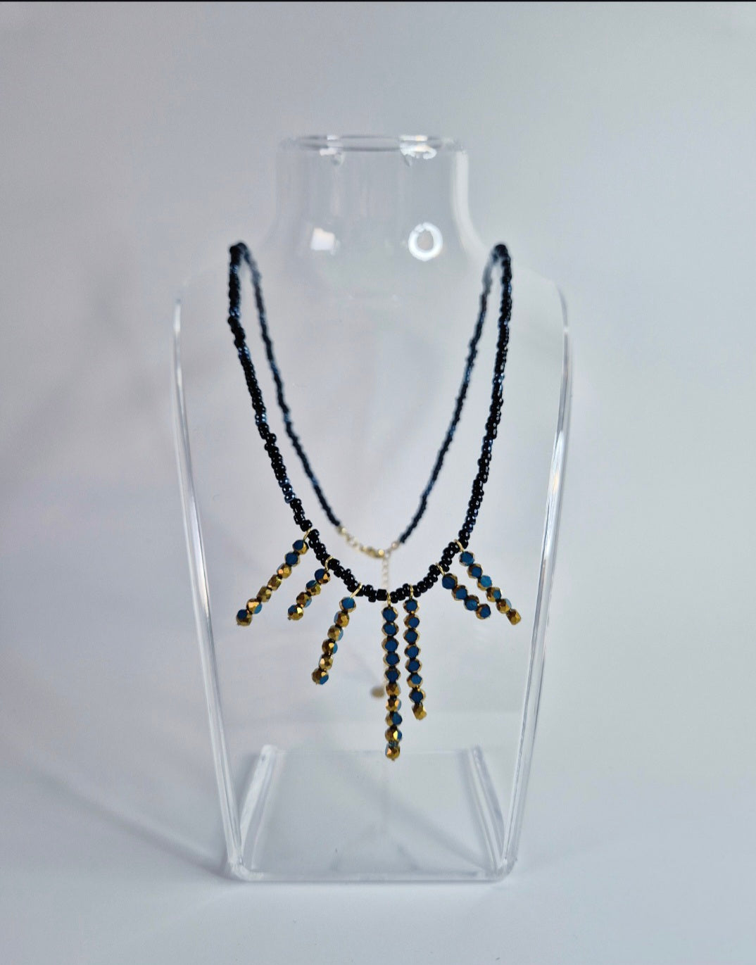 Låt dig omfamnas av styrka och elegans med Leona, ett handgjort halsband skapat för kvinnan som vågar stå i sin kraft. Med skimrande facettslipade pärlor i djupblå och gyllene toner ger detta smycke ett unikt uttryck – perfekt både till vardags och fest