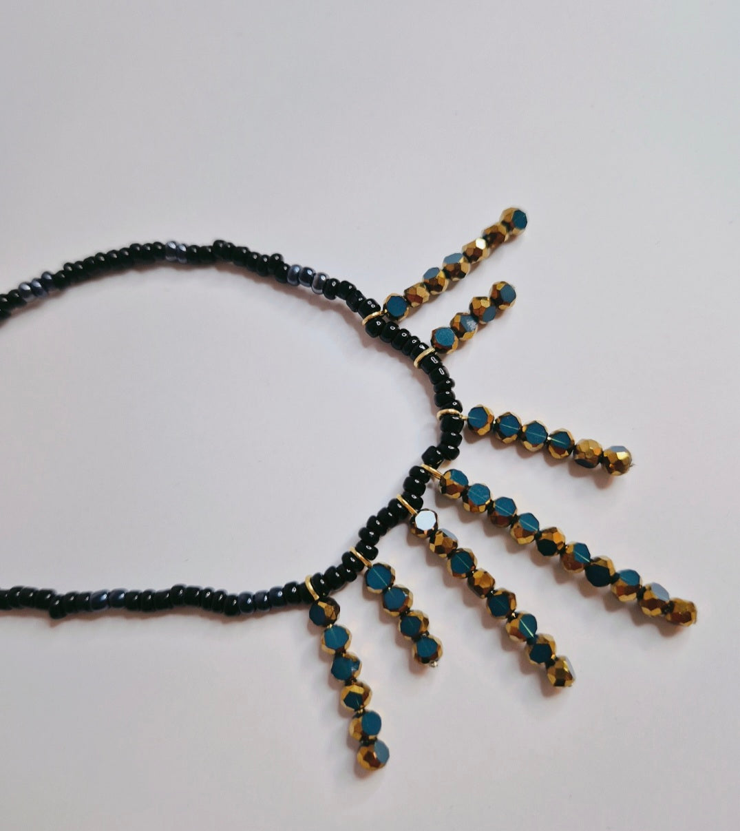 Elegant handgjort halsband i djupt midnattsblått och guld.